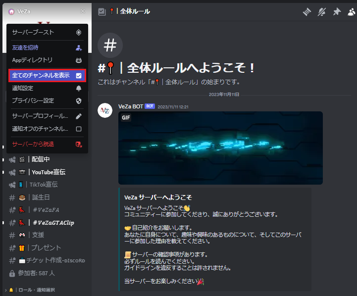 左上のサーバーアイコンをクリックして、全てのチャンネルを表示に☑を入れてください。